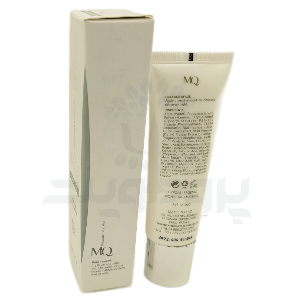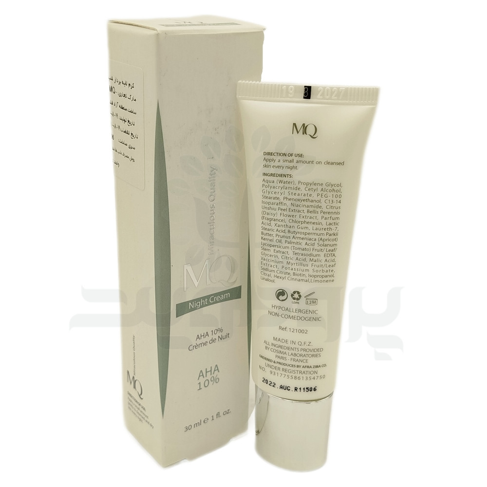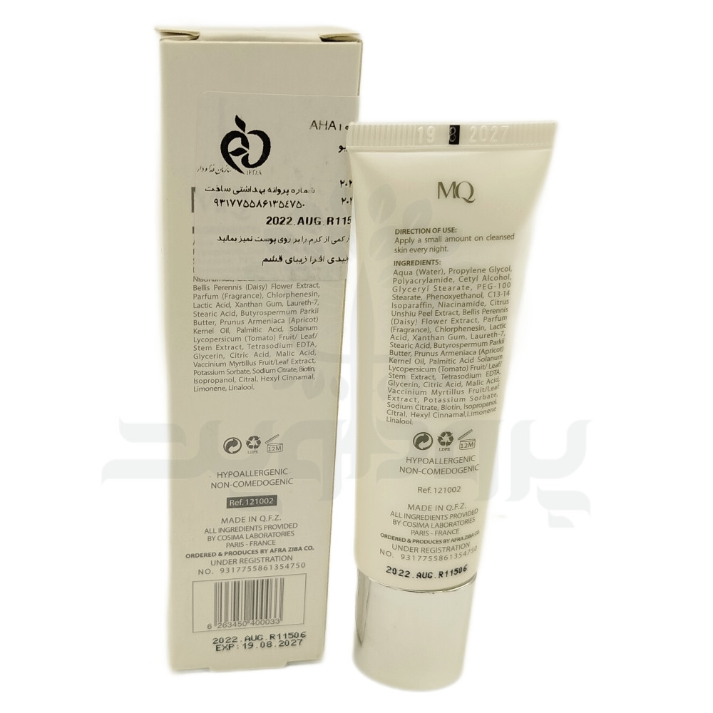 کرم شب لایه بردار AHA ام کیو یک محصول حرفهای برای لایهبرداری ملایم، کاهش لکهای تیره، تحریک کلاژنسازی و افزایش شفافیت پوست است.